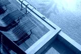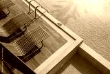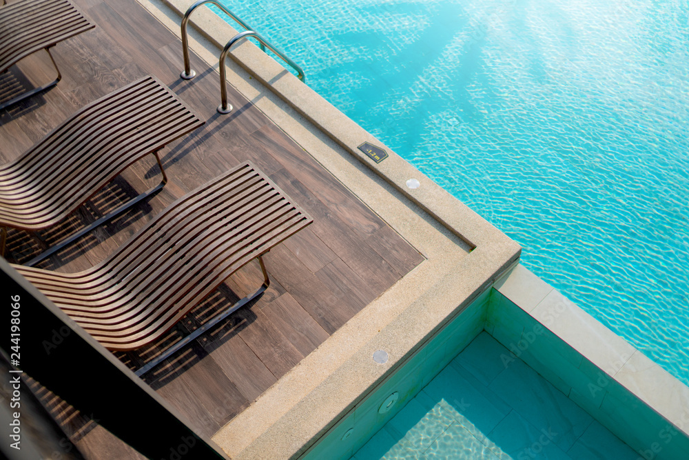 wooden outdoor bench near swimimg pool relax vacation background concept