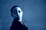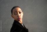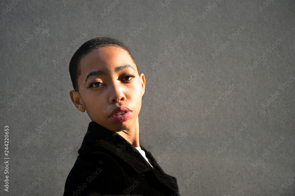 portrait of 20s young African black woman in skin head hair style in natural light with grey wall background