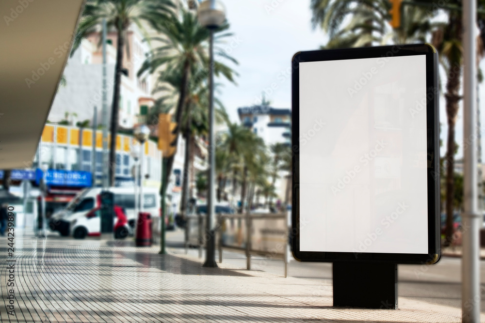 Mock up of blank white vertical light box with palm trees on island Palma de Mallorca in Spain