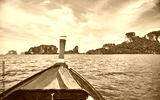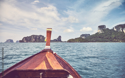 Wooden boat bow with tropical islands in background, color toned picture, Thailand.