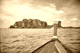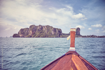 Tropical island seen from a wooden boat, focus on background, color toned picture, Thailand.