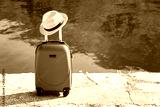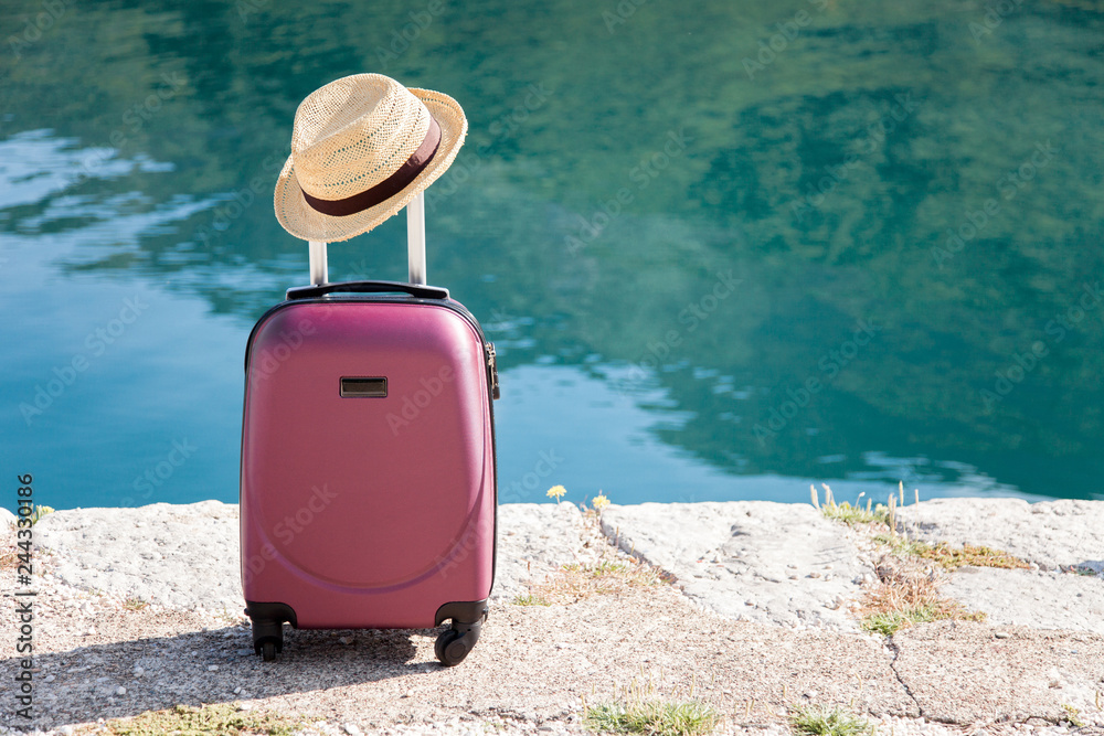 Pink suitcase with straw hat on sea beach. Concept of travel, vacation, female tourism, trip, adventure. Background of blue water, mountains.