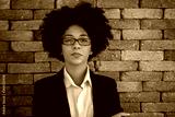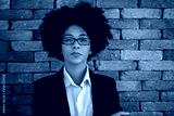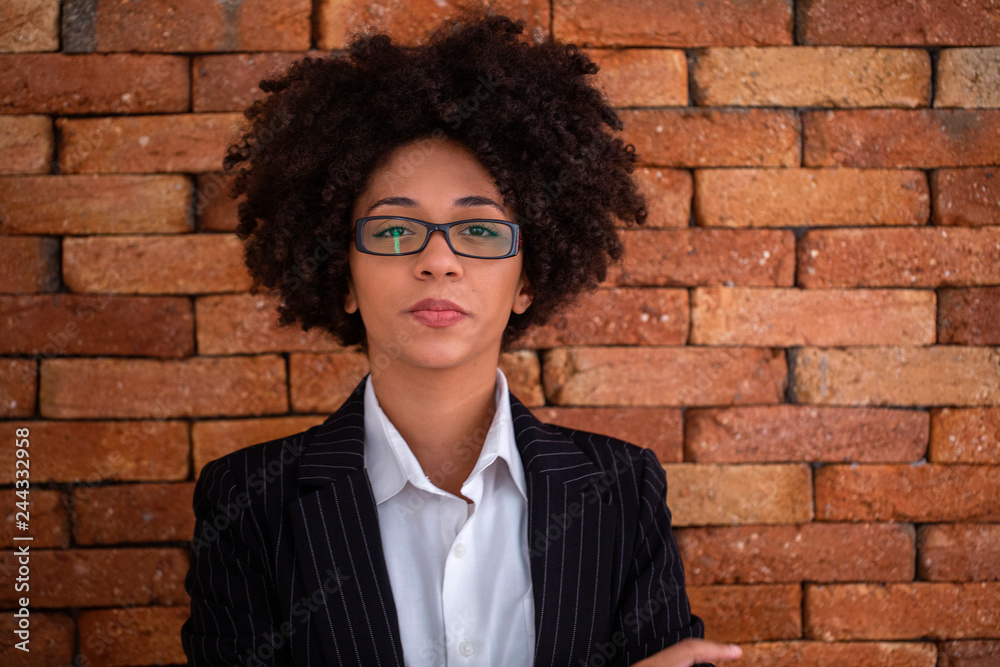 Beautiful African business woman wearing glasses in brick wall background