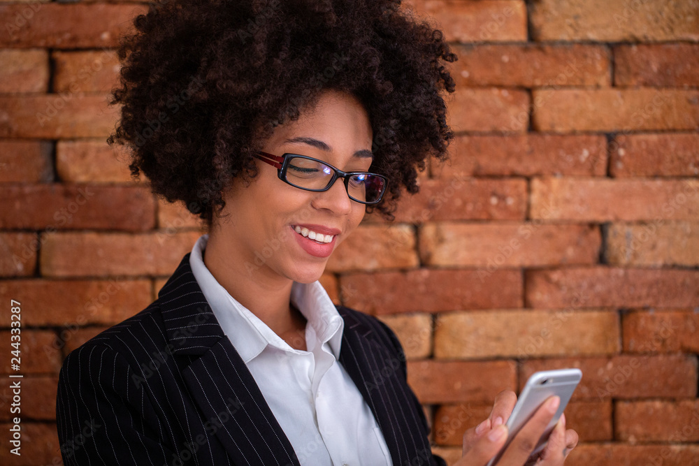 Close up portrait black business woman employee in glasses working in office talking on mobile phone