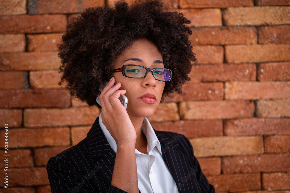 Close up portrait black business woman employee in glasses working in office talking on mobile phone