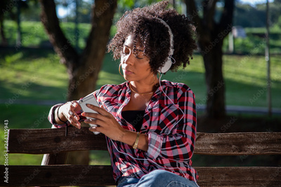 Portrait of a young african american woman listening to music on cell phone - Imagem