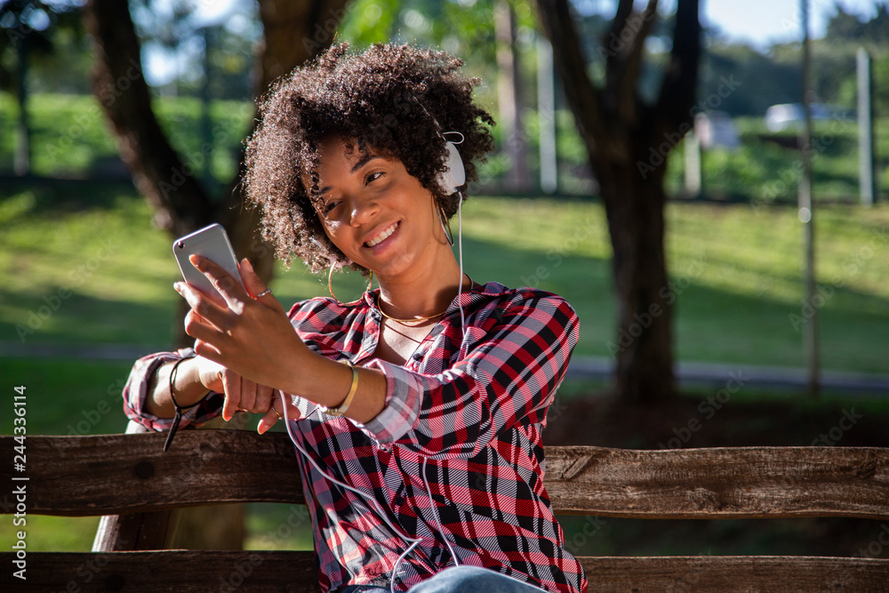 Closeup portrait of smiling young attractive African American woman holding smartphone, taking selfie photo and standing in park with blurred plants in background - Imagem