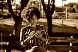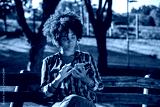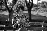 Portrait of a young african american woman listening to music on cell phone - Imagem