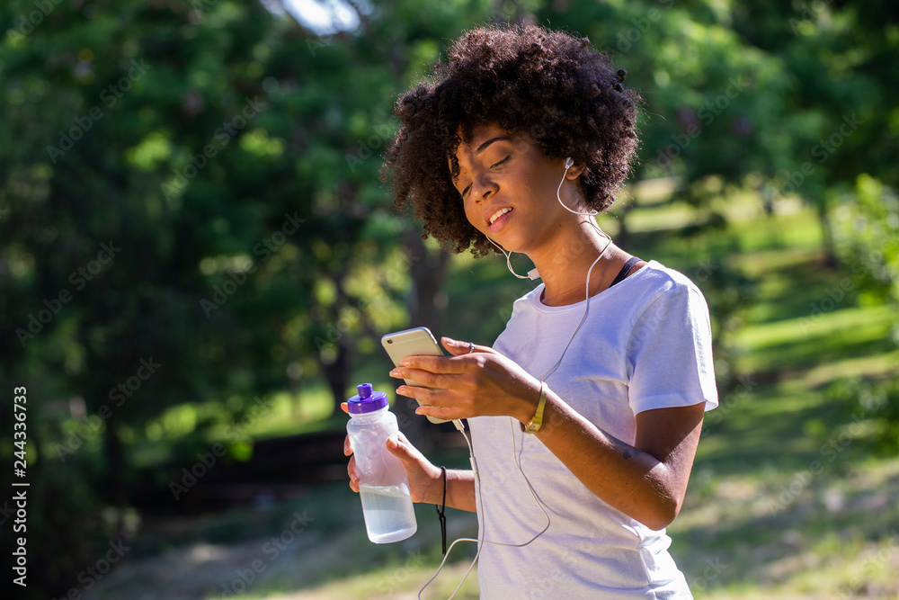 Portrait of a young african american woman listening to music on cell phone - Imagem