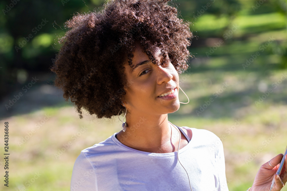 Portrait of a young african american woman listening to music on cell phone - Imagem
