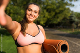 Young beautiful smiling plus size woman in pink sporty top holding orange yoga mat on shoulder joyfully looking in camera while spending time in city park