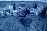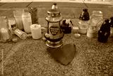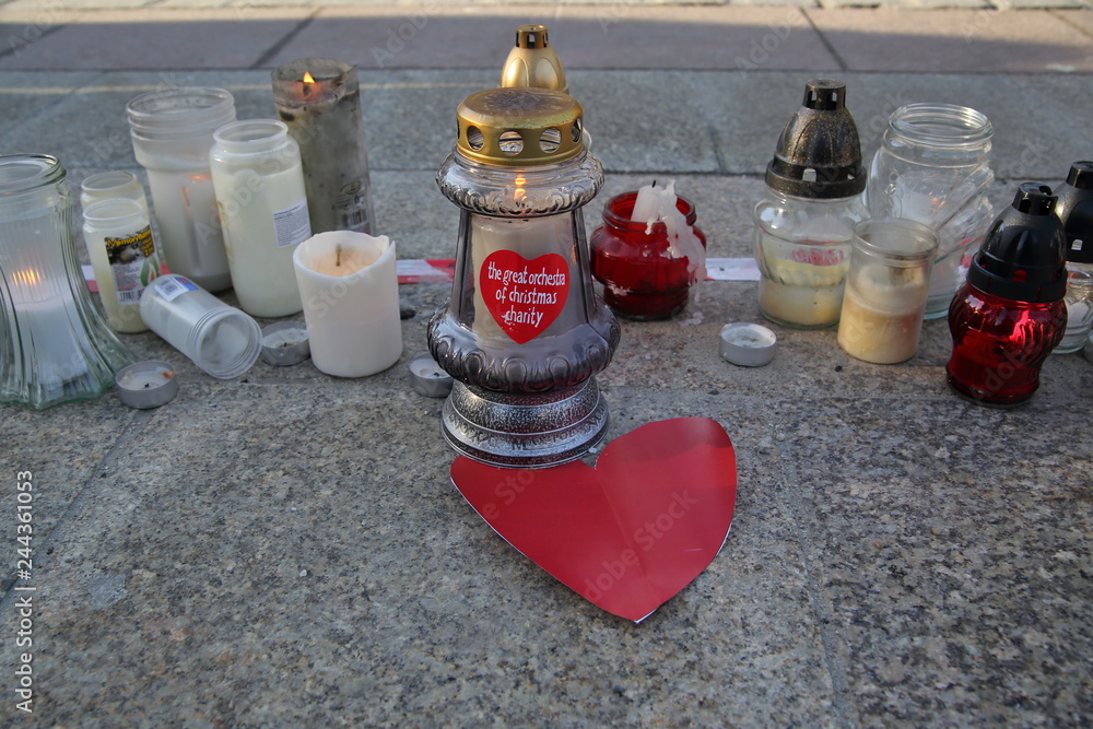 Zapalone znicze, świece, słynne czerwone serduszko z napisem The Great Orchestra of Christmas Charity, czerwone serce z papieru, na ziemi