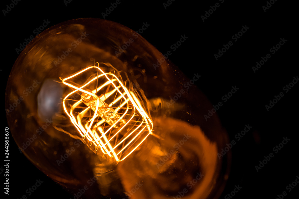 top of view of turn on in slow motion with dust, retro vintage light bulb with old technology with filament built-in with warm light yellow tint and black background, vintage object old