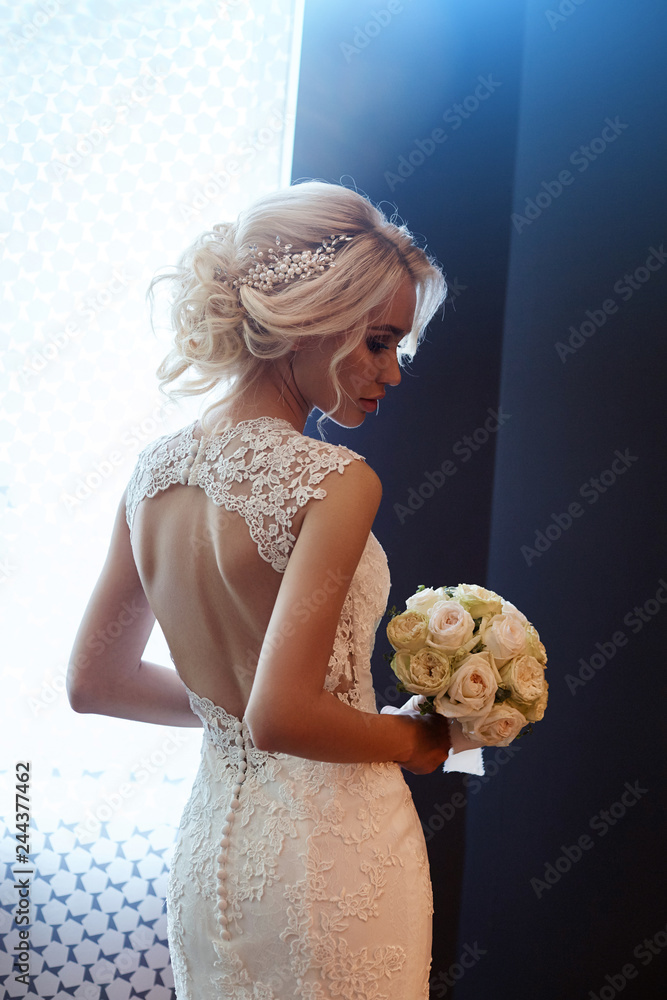 Morning bride. A woman in a white wedding dress holding a bouquet of flowers in her hands. Beautiful blonde girl getting ready for wedding ceremony