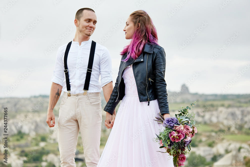 Embrace and kiss a couple in love on a spring morning in nature. Valentine's day, a close relationship between a man and a woman. Man kissing girl with bright colored hair, creative coloring