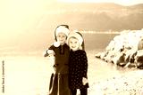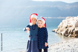 Kids in Santa hats on Christmas sea beach. Little girls are hugging and smiling. Two cute sisters have winter and New Year vacations in warm destinations. Children emotions outdoors.