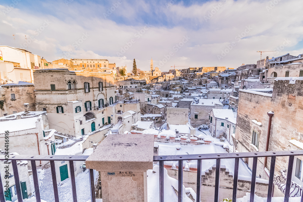panoramic view of Sassi di Matera and church of Matera 2019 under blue sky with clouds and snow on the house, concept of travel and christmas new year holiday,capital of europe culture 2019