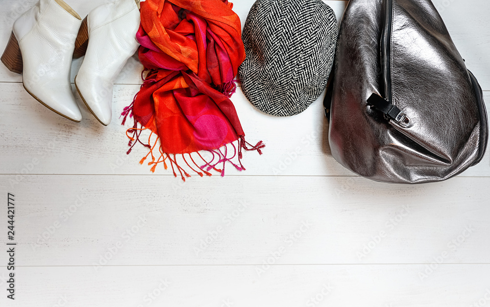 Top view female outfit collection dress white boots red scarf cap silver bag backpack accessories on white wooden background. Valentine's Day lifestyle conception. Flat lay, horizontal, copy space