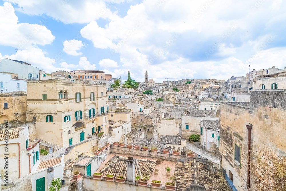panoramic view of typical stones Sassi di Matera and church of Matera 2019 under blue sky,capital of europe culture 2019