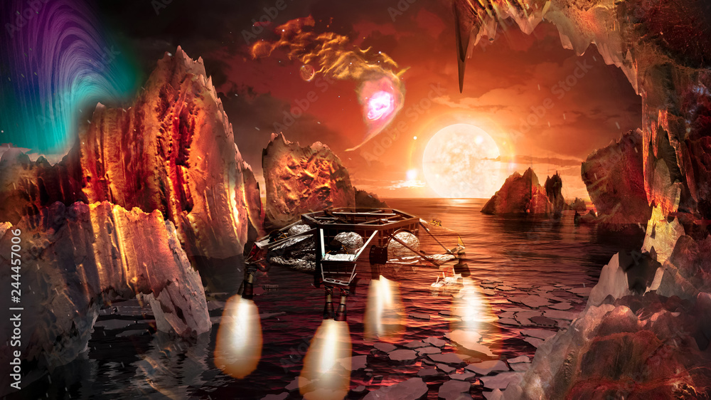 Spaceship landing on alien planet, with strange, rocky mountains with caves landscape with lake. Elements of this image furnished by NASA