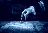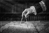 The captain of the old ship paves the course with the help of vintage maps and nautical divider. Old discovery, explorer, history, pirates, travel, geography and navigate background.