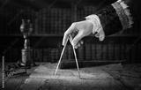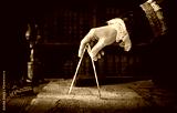 The captain of the old ship paves the course with the help of vintage maps and nautical divider. Old discovery, explorer, history, pirates, travel, geography and navigate background.