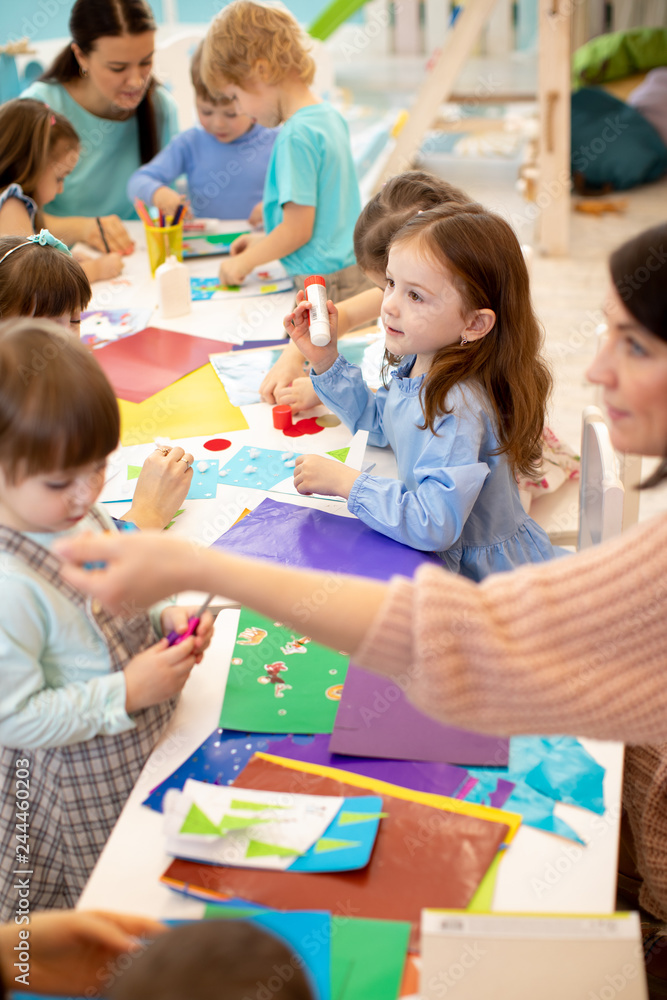 Art and craft activity in the kindergarten. Group of preschool kids hands working in daycare center.