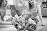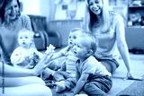 Nursery teacher and babies playing with educational toys in kindergarten or day care centre