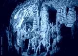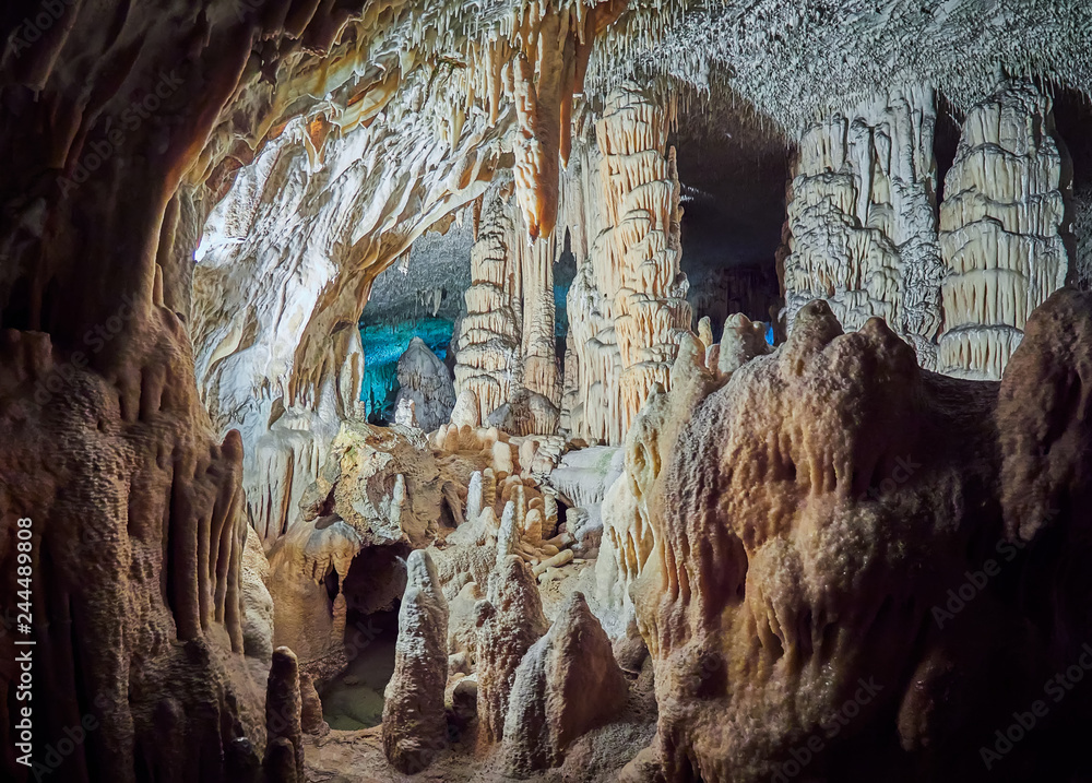 View of stalactites and stalagmites in an underground cavern - Postojna cave in Slovenia