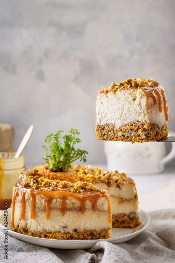 Piece of carrot cheesecake with nuts and salted caramel topping.