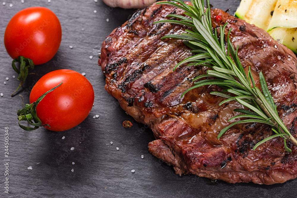 Juicy medium rare beef steak slices on ceramic board with herbs spices and salt.
