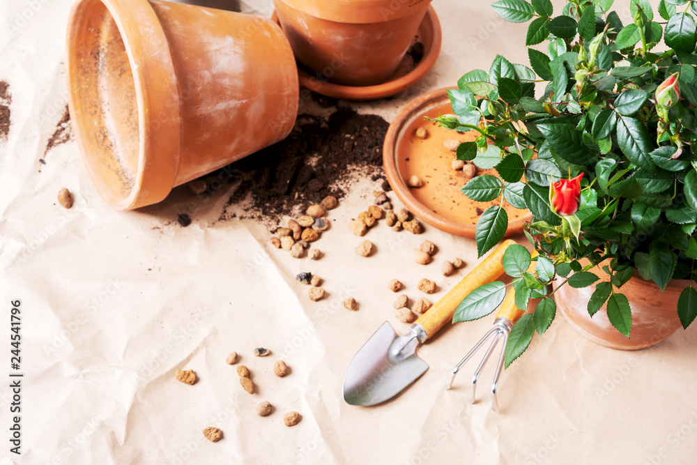 Mini Roses in ceramic flower pots and gardening tools with free space for text. Planting Roses in pot at home.