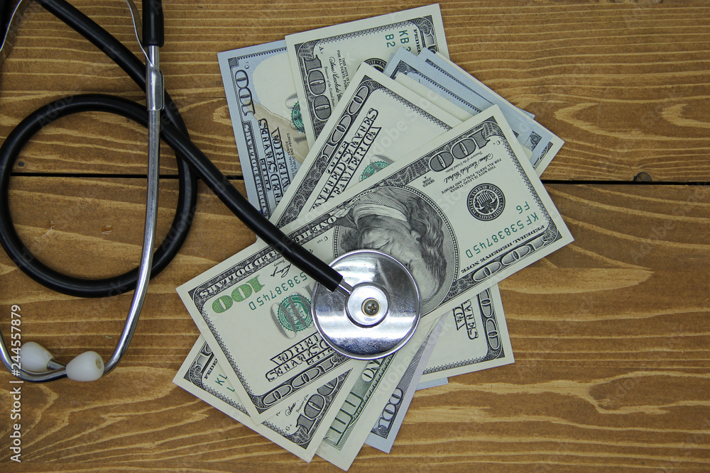 Pharmacy background on a wooden table. Medicine and health. Stethoscope and money on wooden background. Copy space for text. Expensive treatment