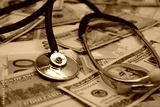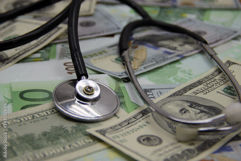 Pharmacy background on a wooden table. Medicine and health. Stethoscope and money on wooden background. Copy space for text. Expensive treatment
