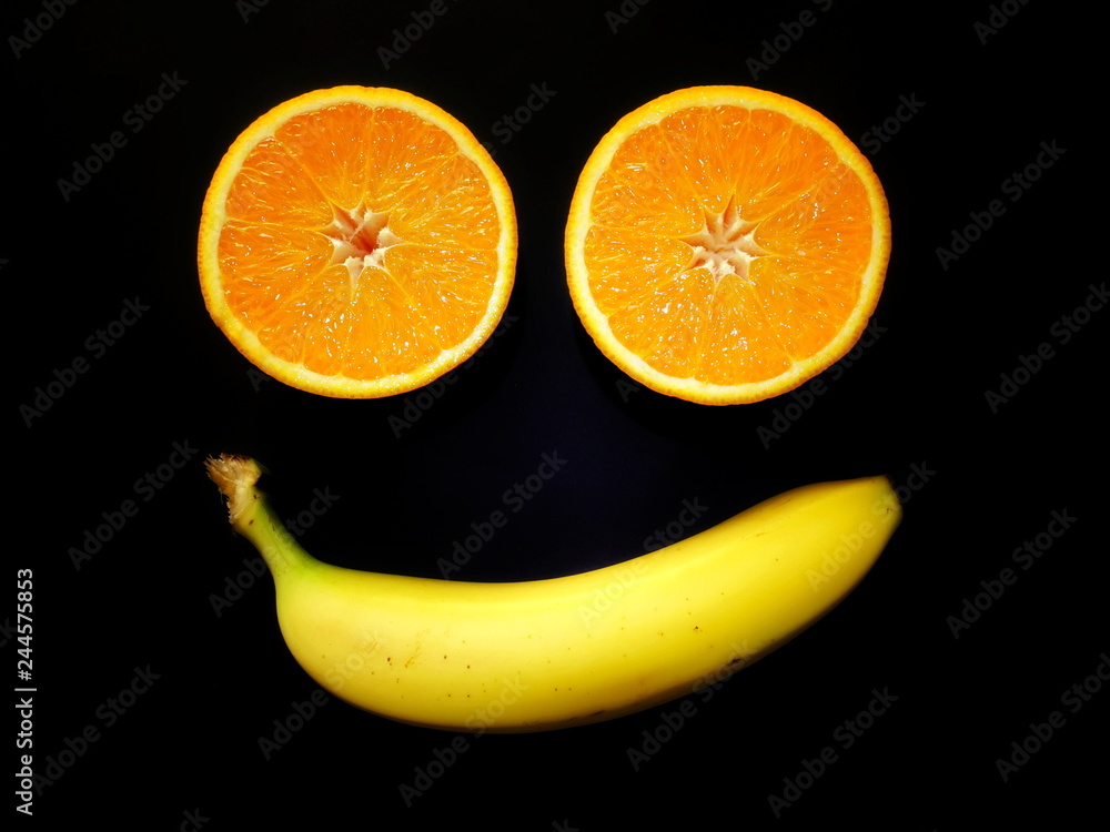 Fruit smile. Simple fruit face made of banana and two orange halves on black background