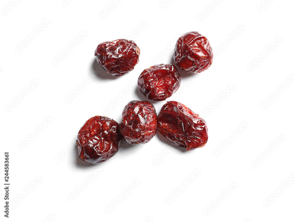 Cranberries on white background, top view. Dried fruit as healthy snack