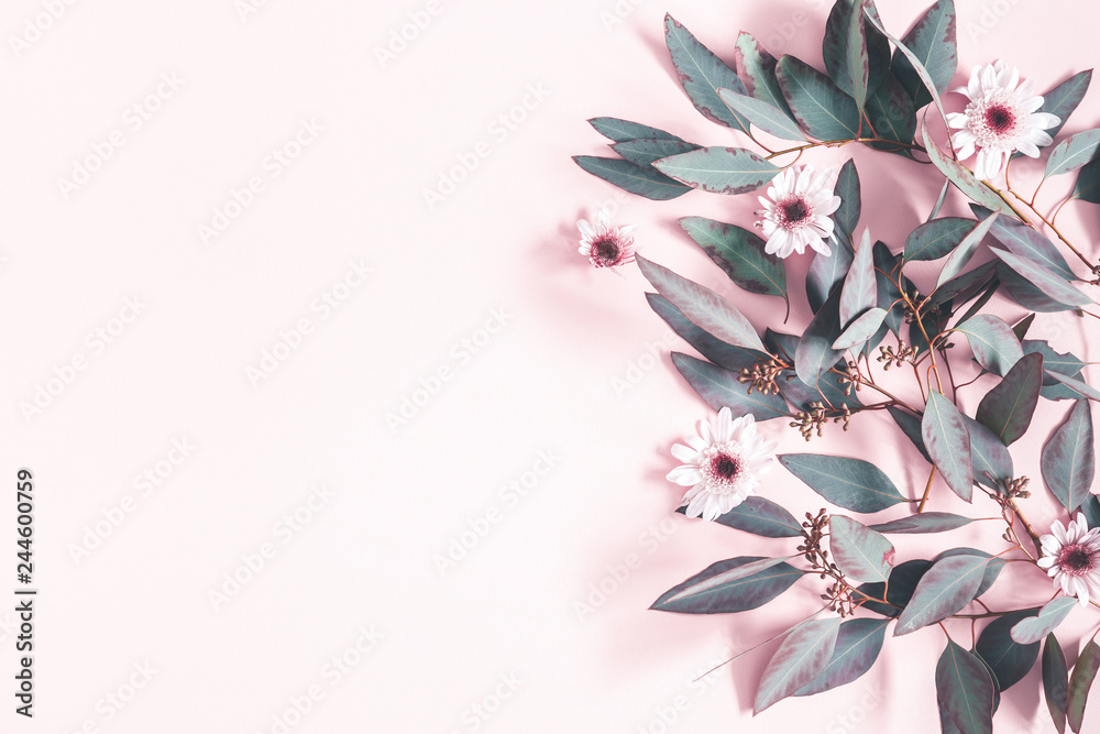Flowers composition. Eucalyptus leaves and pink flowers on pastel pink background. Flat lay, top view, copy space
