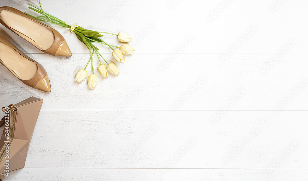 Flat lay female outfit collection dress: beige shoes handbag accessories gold heart tulips and toy dog on white wooden background. Valentine's Day Spring Autumn women lifestyle. Top view, copy space