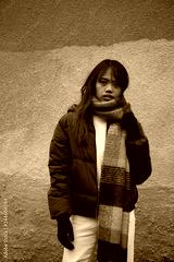 portrait of 20s long hair Asian Filipino woman wearing red coat and scarf with grey wall background