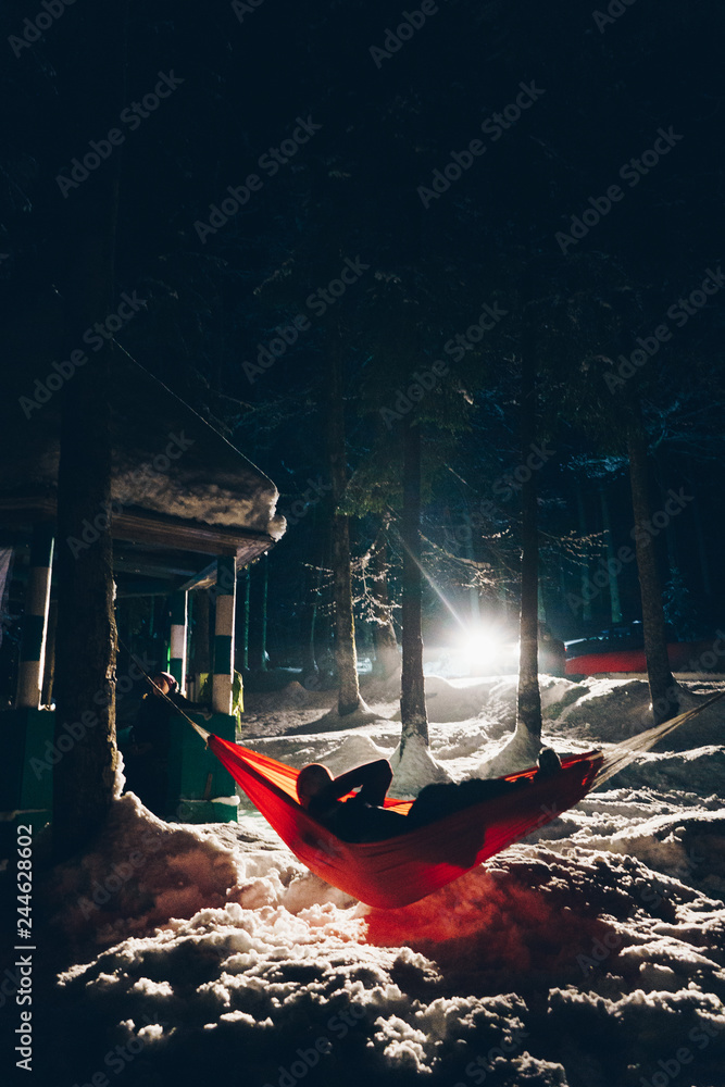 Woman lying in red hammock under the trees in the night forest. Woman relaxing. Camping in winter