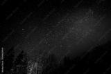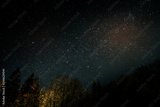 Beautiful night sky with many stars shining over the pine tree forest in the mountains