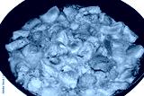The meat is fried in a frying pan on a white background.Roast meat in a frying pan.Fried meat background.