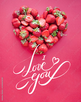 Happy Valentine's Day hand drawn calligraphy text and heart shaped strawberry.