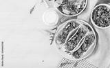 Mexican tacos with chicken meat, corn and tomato sauce. Latin American cuisine. Taco, tortilla, wrap. Top view. Flat lay
