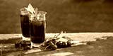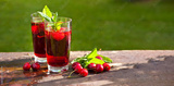 Summer non-alcoholic cocktail of cherries on the background of the summer garden. Useful food concept. Copy space.