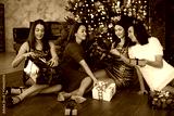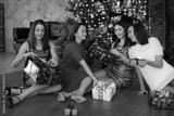 Young women girlfriends open gifts at a New Year's party near the Christmas tree.