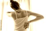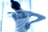 Young woman suffering from neck pain and backache, stretching the muscles.