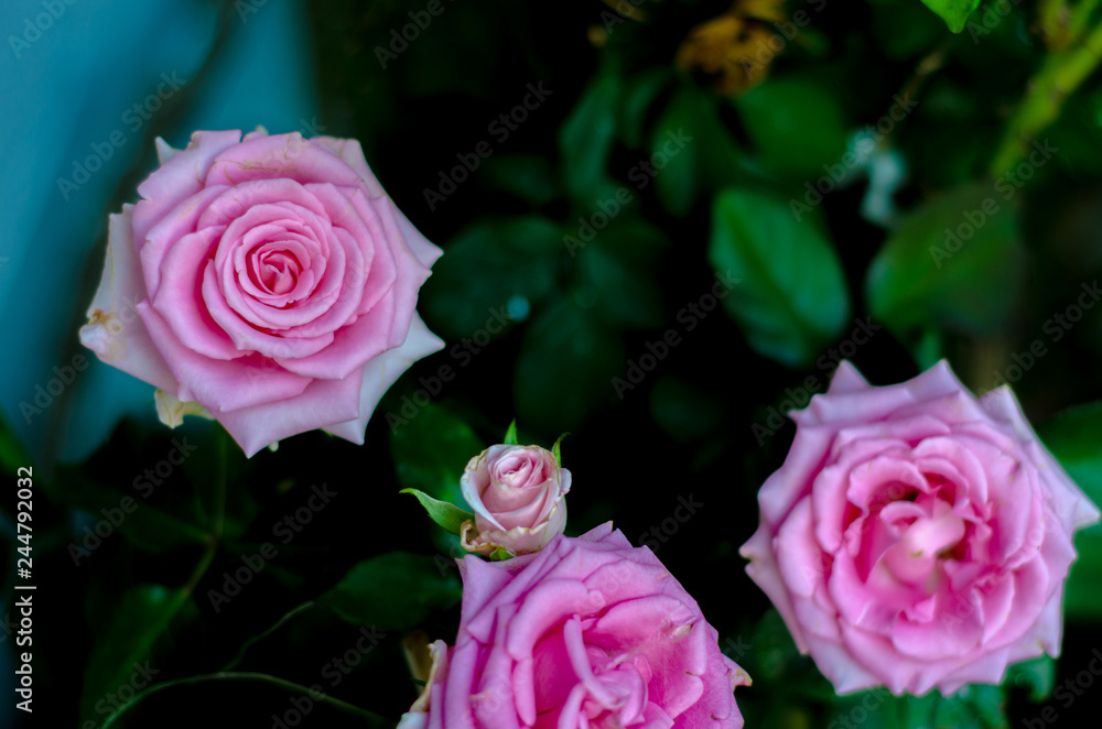 Pink roses in the morning garden.Dark green tone.Do not focus on objects.