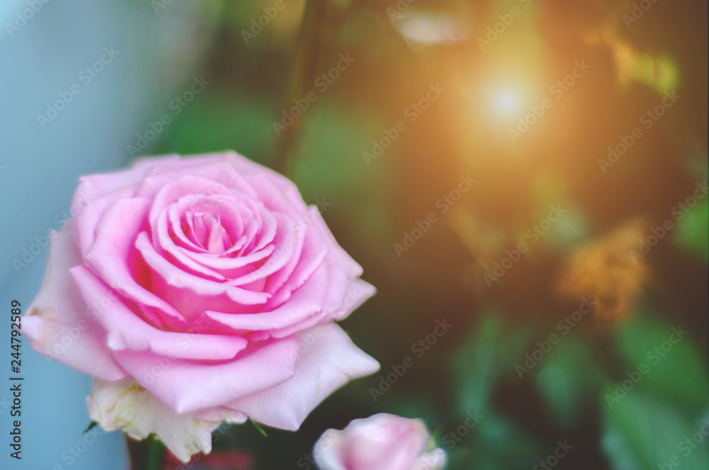 Pink roses in the morning garden.Dark green tone.Do not focus on objects.