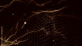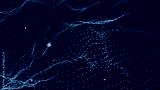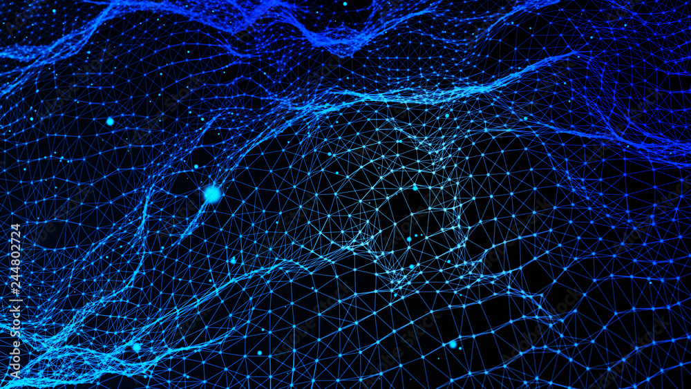 Abstract background with dynamic blue wave. Particle placement with hanging dots in space. Large data background. 3D rendering.